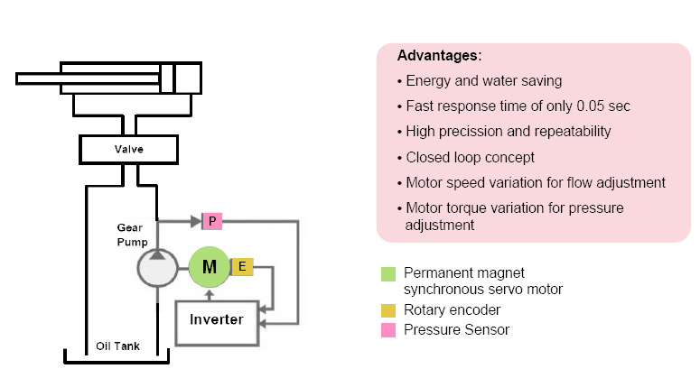 La seconda applicazione denominata “servo-pompa” è la naturale evoluzione dell’idea sopra descritta, ma viene introdotto un servomotore associato ad una pompa ad ingranaggi ad alta efficienza